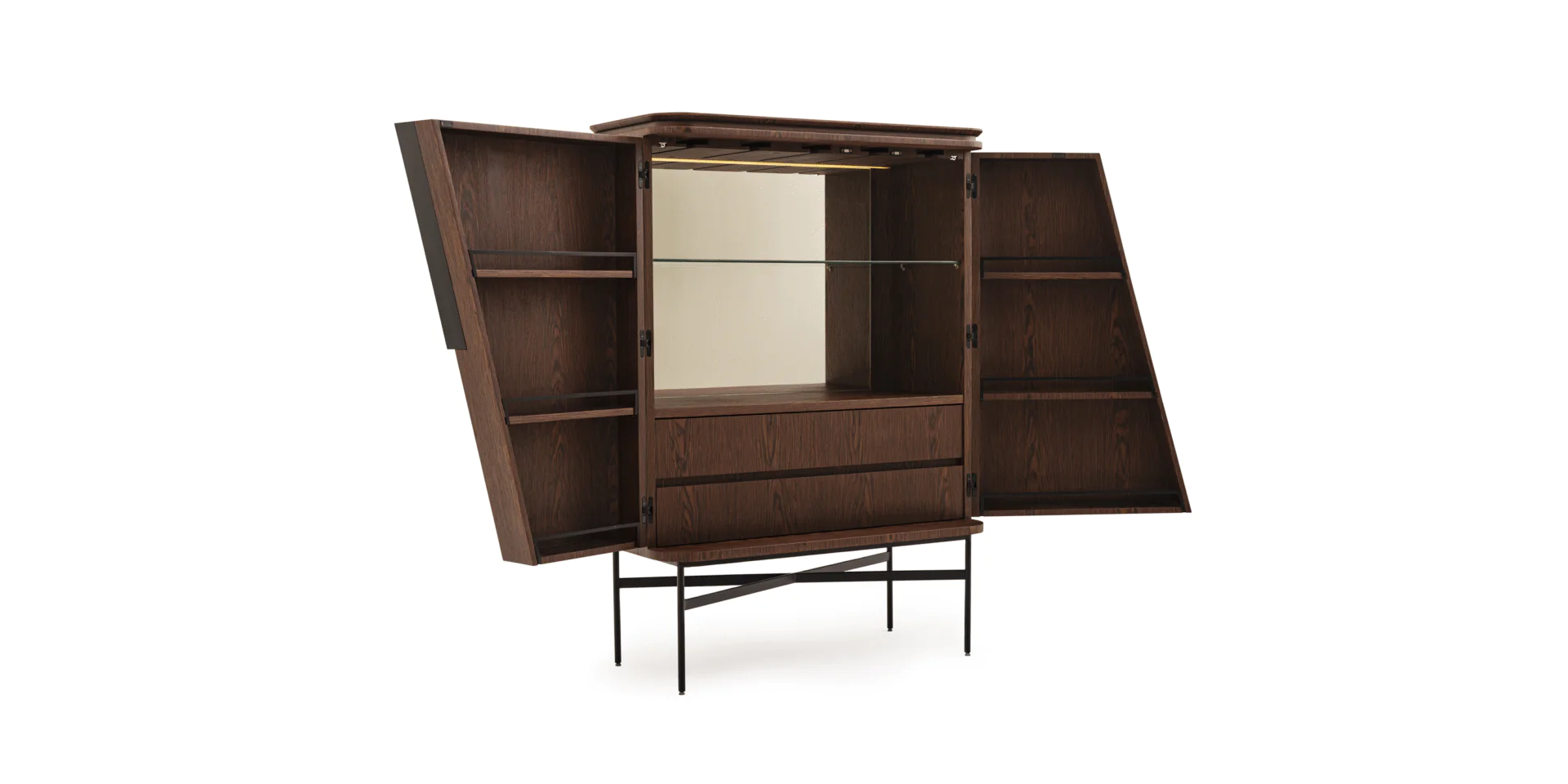 Bar sofisticado com corte chanfrado nas portas, base metálica e acabamento personalizável. Possui prateleiras, gavetas e opcionais como porta-taças, espelho e iluminação LED para ambientes sociais com estilo e praticidade.