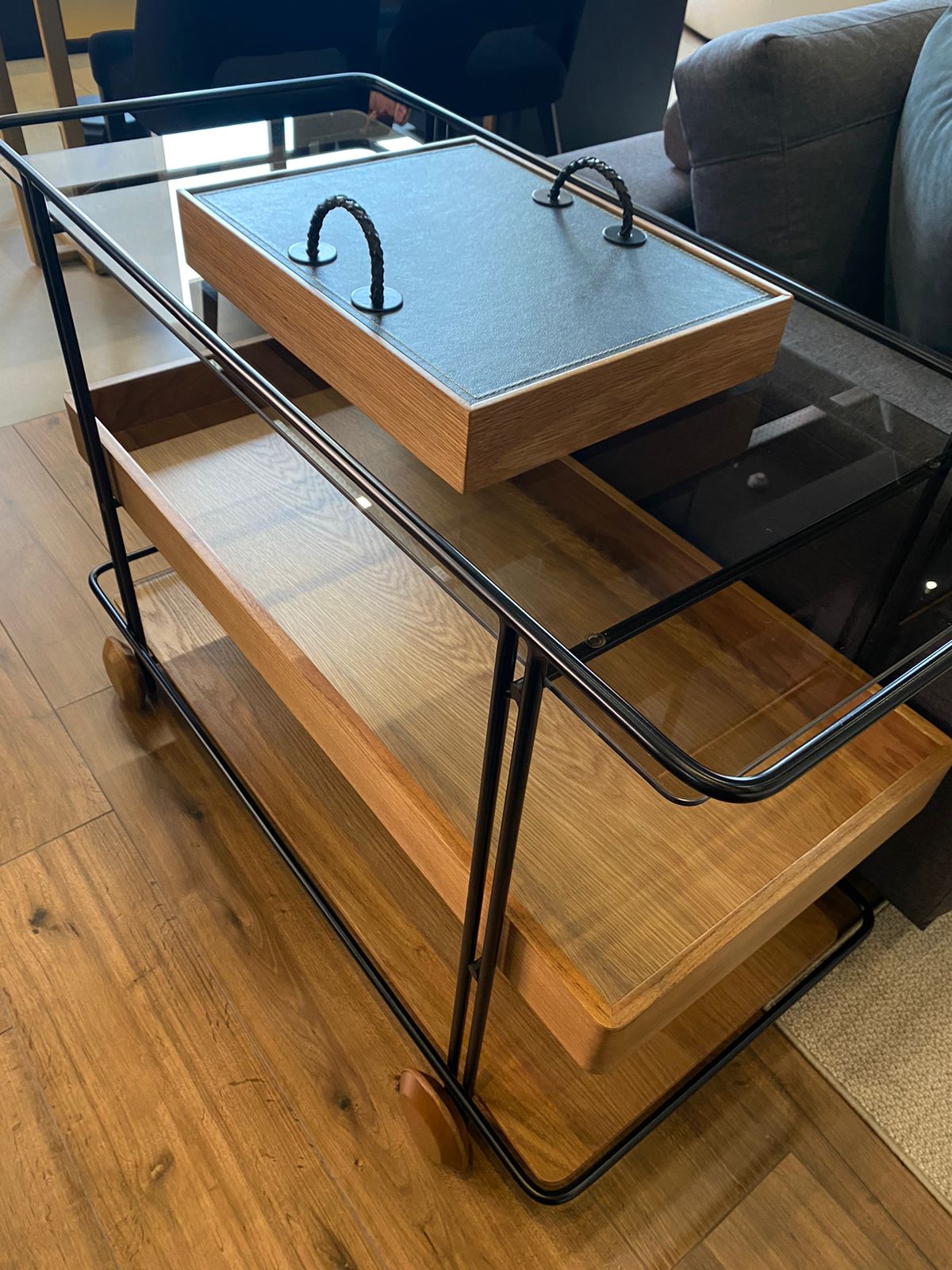 Apimente suas reuniões com o sofisticado Carrinho-Bar Adis da Corbelli. Com três andares práticos, este carrinho apresenta uma bandeja com detalhes em couro preto envelhecido, que traz um toque de elegância. O primeiro andar em vidro proporciona um visual moderno e sofisticado, ideal para exibir suas bebidas favoritas. Perfeito para servir drinks e petiscos, o Carrinho-Bar Adis é a escolha ideal para quem valoriza estilo e funcionalidade em qualquer ocasião! RECOURO PRETO ENVELHECIDOMETAL PRETO FOSCO A 70 x L 100 x C 501 UN