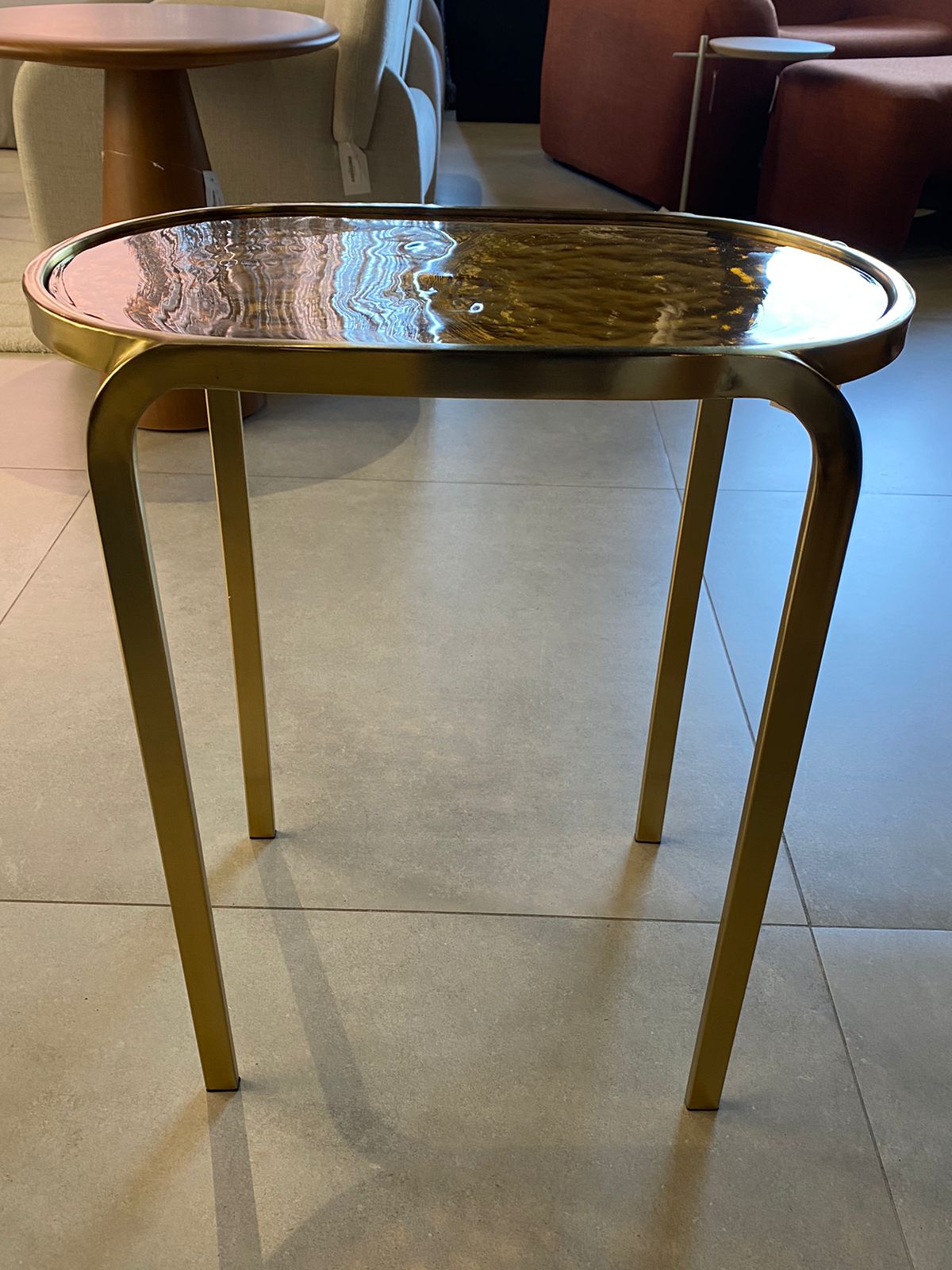 A mesa de apoio oval da Lucatti é um verdadeiro ícone de sofisticação. Com uma estrutura em metal dourado, ela irradia elegância e modernidade. O tampo em vidro âmbar adiciona um toque de calor e profundidade, criando um contraste perfeito que realça seu design sofisticado. Ideal para salas de estar ou espaços de convivência, essa mesa não apenas serve como um elemento funcional, mas também como uma peça de destaque na decoração. Eleve seu ambiente com a beleza atemporal da mesa de apoio dourada da Lucatti!METAL DOURADOVIDRO AMBARA 60 x L 50 x C 301 UN