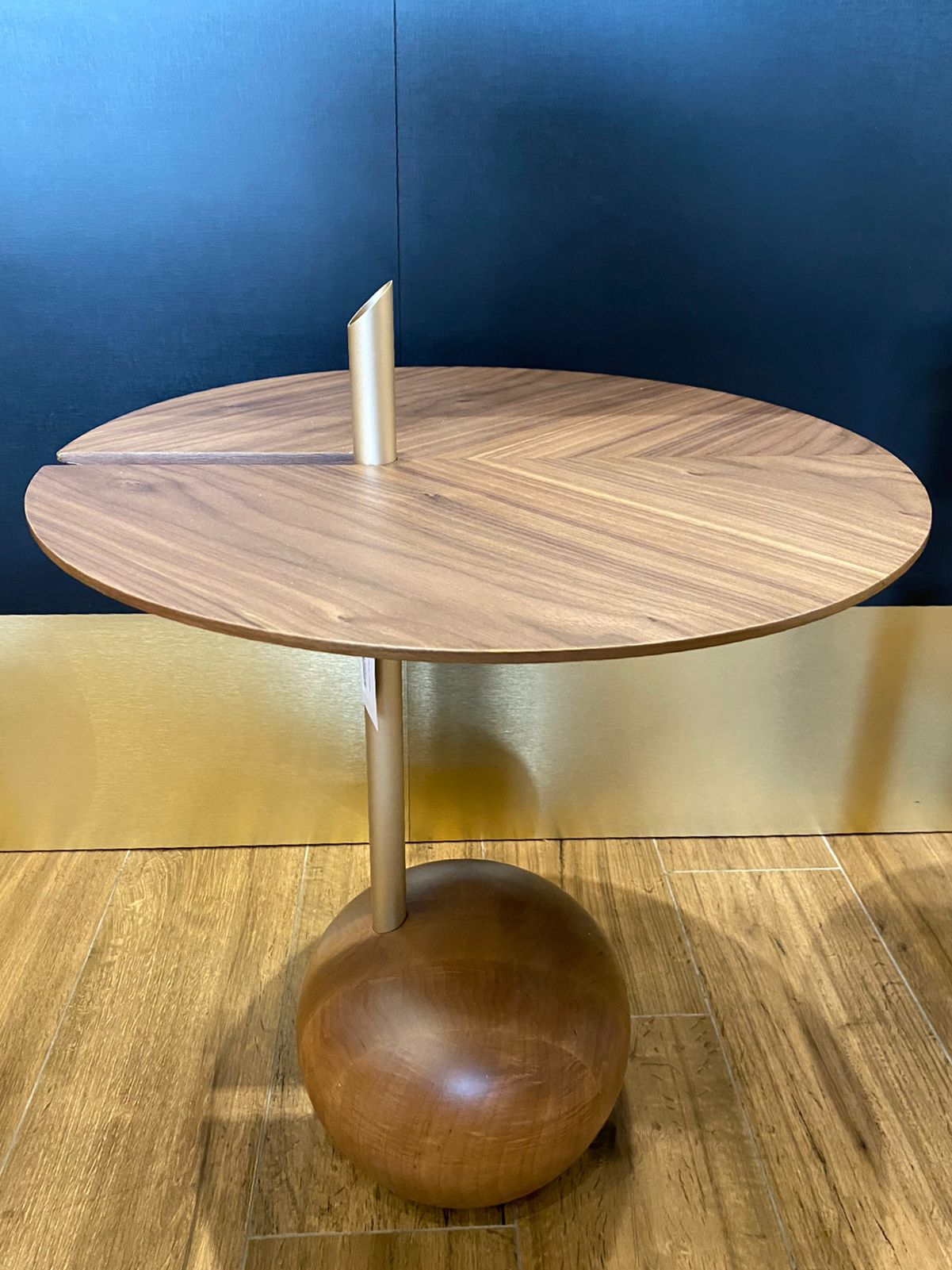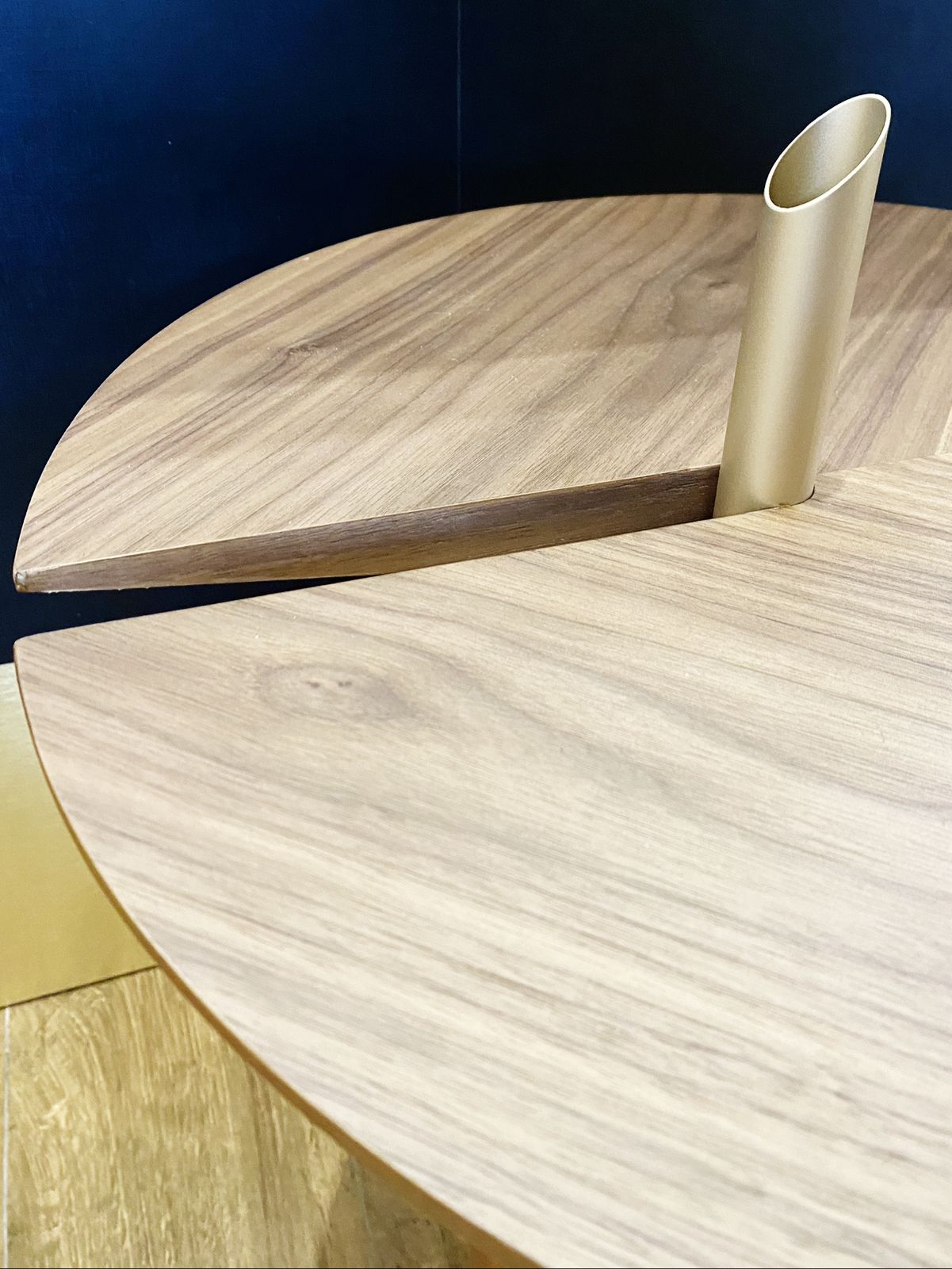 O desenho é inspirado na natureza, a tendência de biofilia que busca integrar a natureza aos espaços da casa. O conceito busca traduzir a poética de uma árvore no solo e está evidenciado no pedestal da mesa que pode acolher uma folha ou arranjos secos, compondo com as lâminas de madeira natural do tampo, que é marchetada para trazer ao produto a memória das nervuras da folha de uma árvore, e junto delas a sensação de vida e liberdade que a natureza proporciona. A base feita de uma esfera de madeira nos traz a sensação do solo, das pedras e madeira, que nos trazem a percepção de repouso e segurança.A 55 x D 501 UN