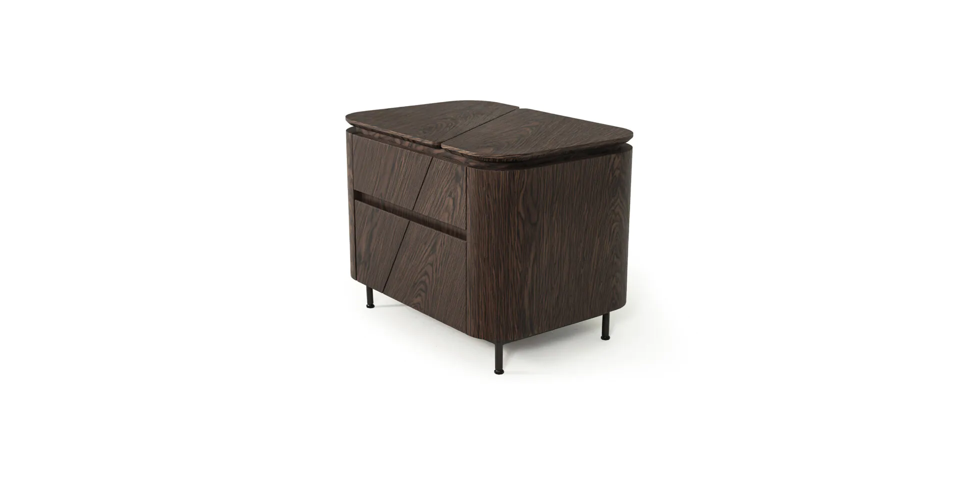 Mesa de cabeceira sofisticada com opções de formato e acabamento. Estrutura em aço carbono com gavetas ou prateleira, design elegante que une funcionalidade e presença marcante para complementar seus ambientes.